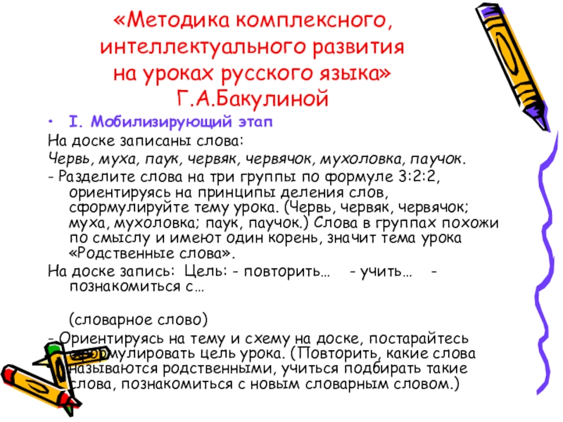 - Разделите слова на три группы по формуле 3:2:2, ориентируясь на принципы деления слов, сформулируйте тему урока. (Червь, червяк, червячок; муха, мухоловка; паук, паучок.) Слова в группах похожи по смыслу и имеют один корень, значит тема урока «Родственные слова».