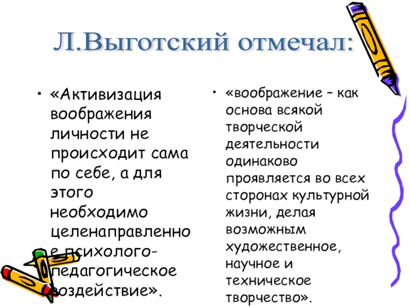 «воображение – как основа всякой творческой деятельности одинаково проявляется во всех сторонах культурной жизни, делая возможным художественное, научное и техническое творчество».