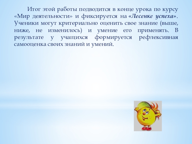 урока по курсу «Мир деятельности» и фиксируется на «Лесенке успеха». Ученики могут критериально оценить свое знание (выше, ниже, не изменилось) и умение его применять. В результате у учащихся формируется рефлексивная самооценка своих знаний и умений.