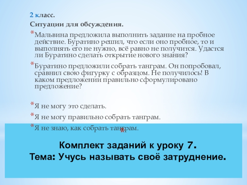 Буратино предложили собрать танграм. Он попробовал, сравнил свою фигурку с образцом. Не получилось! В каком предложении правильно сформулировано предложение?