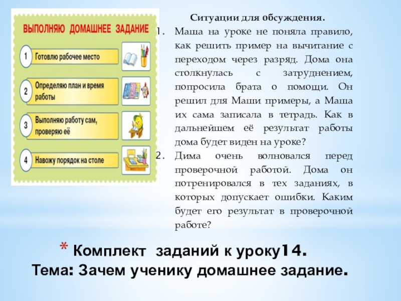 на уроке не поняла правило, как решить пример на вычитание с переходом через разряд. Дома она столкнулась с затруднением, попросила брата о помощи. Он решил для Маши примеры, а Маша их сама записала в тетрадь. Как в дальнейшем её результат работы дома будет виден на уроке?