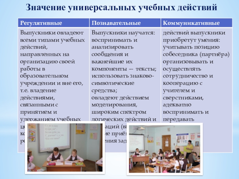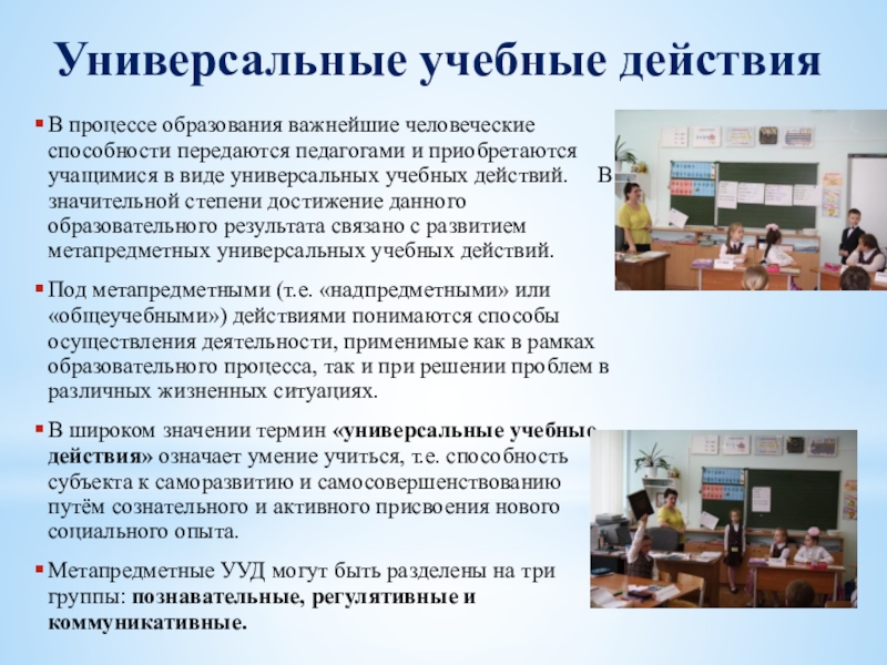 В широком значении термин «универсальные учебные действия» означает умение учиться, т.е. способность субъекта к саморазвитию и самосовершенствованию путём сознательного и активного присвоения нового социального опыта.
