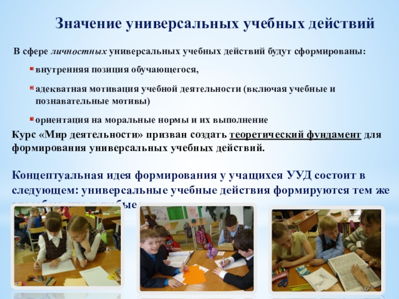 Курс «Мир деятельности» призван создать теоретический фундамент для формирования универсальных учебных действий.