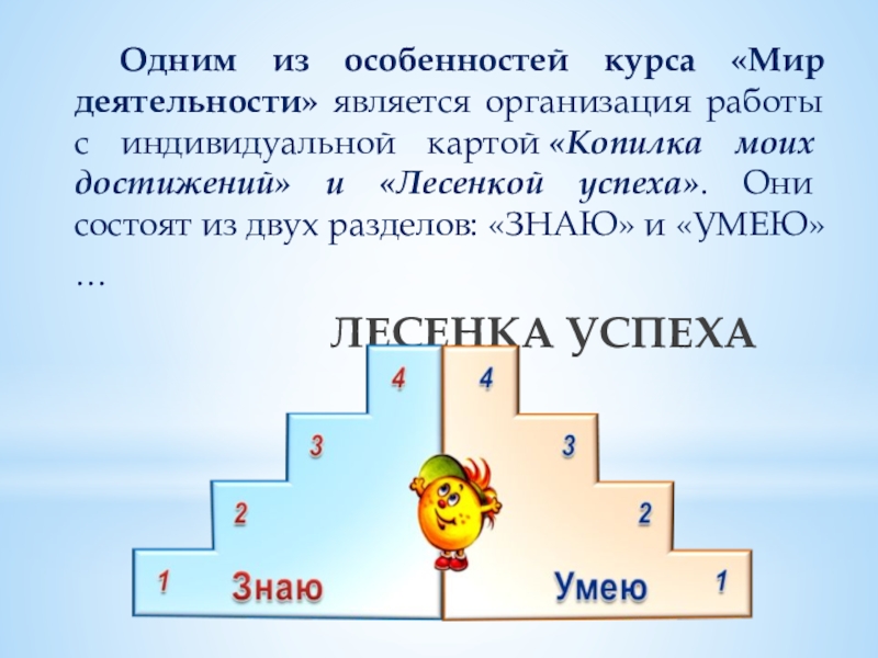 картой «Копилка моих достижений» и «Лесенкой успеха». Они состоят из двух разделов: «ЗНАЮ» и «УМЕЮ»…