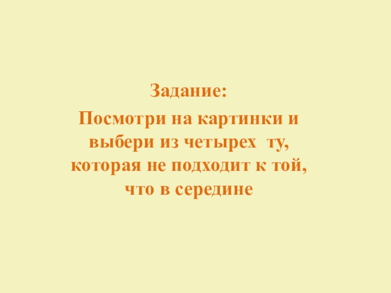 Задание:Посмотри на картинки и выбери из четырех ту, которая не подходит к той, что в середине