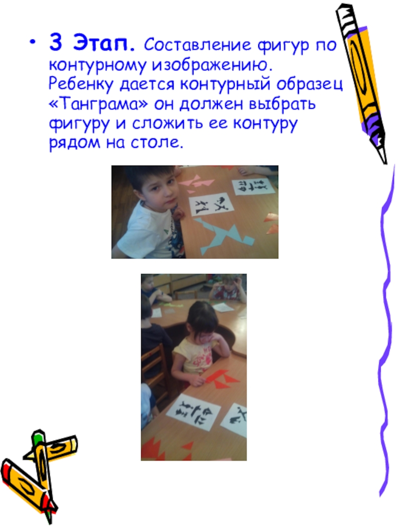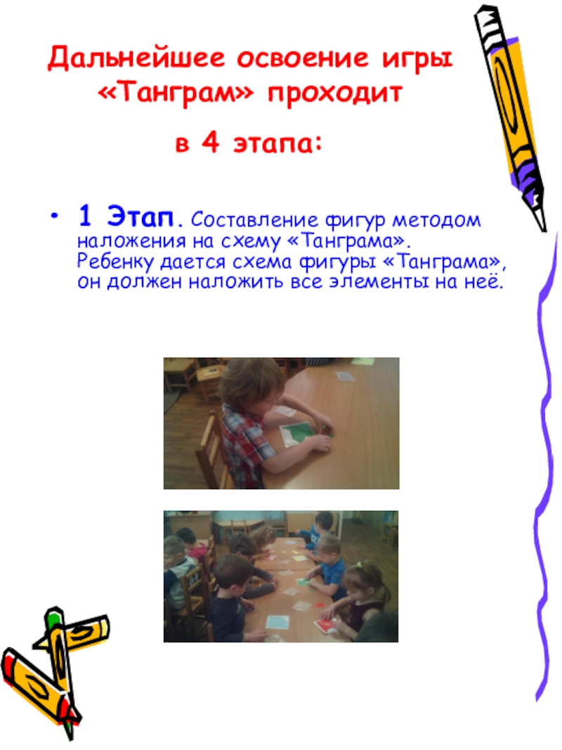Дальнейшее освоение игры «Танграм» проходит в 4 этапа: 1 Этап. Составление фигур методом наложения на схему «Танграма».