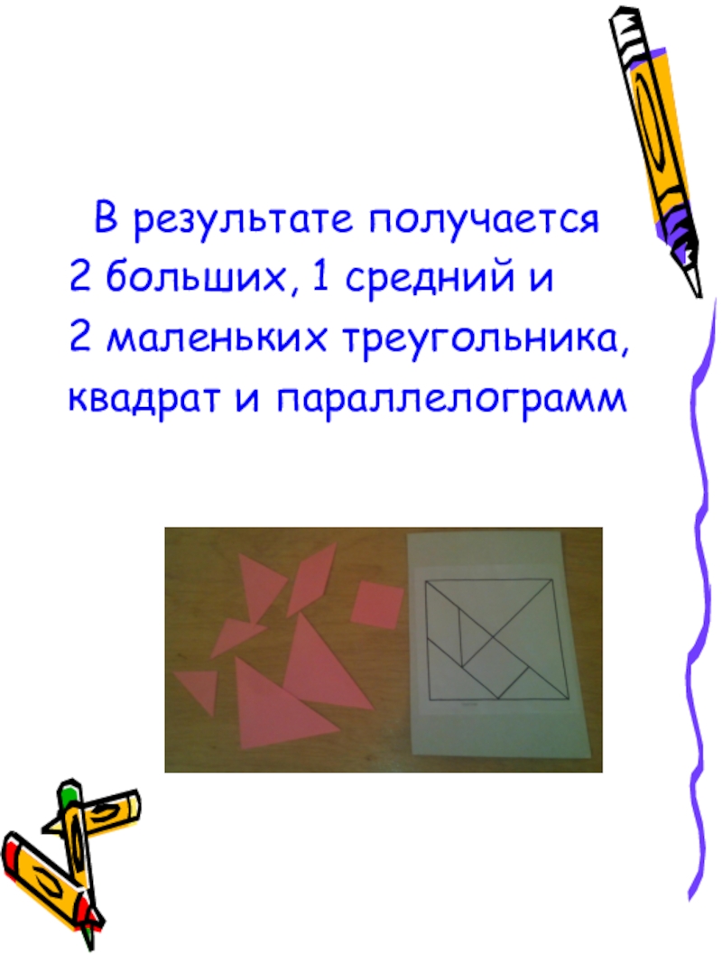 В результате получается2 больших, 1 средний и2 маленьких треугольника,квадрат и параллелограмм