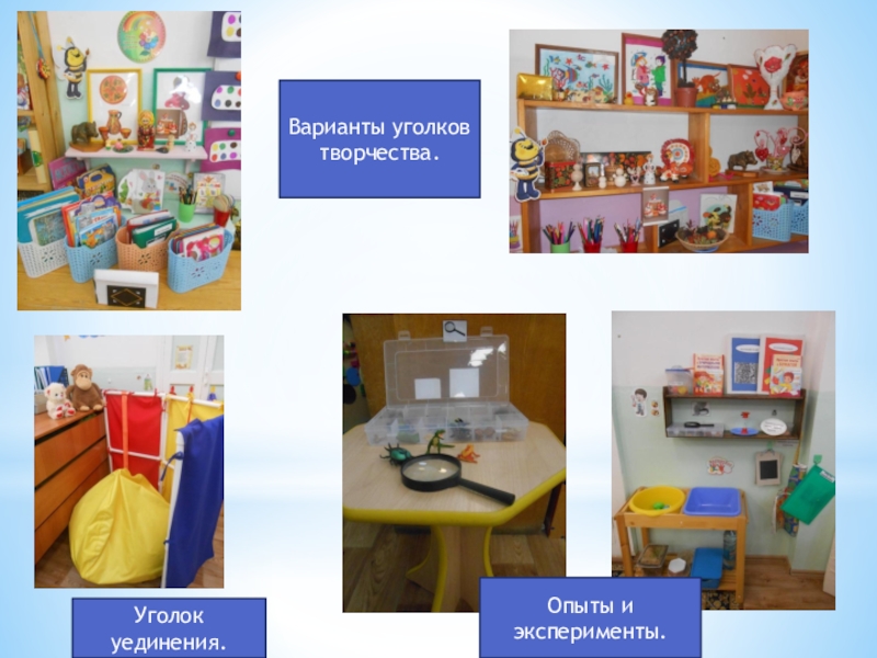 Варианты уголков творчества.Опыты и эксперименты.Уголок уединения.