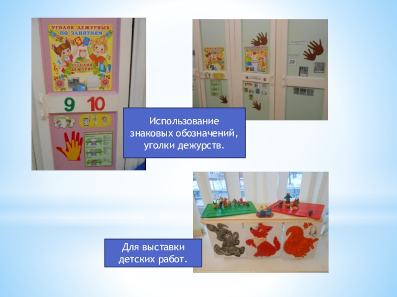 Использование знаковых обозначений, уголки дежурств.Для выставки детских работ.