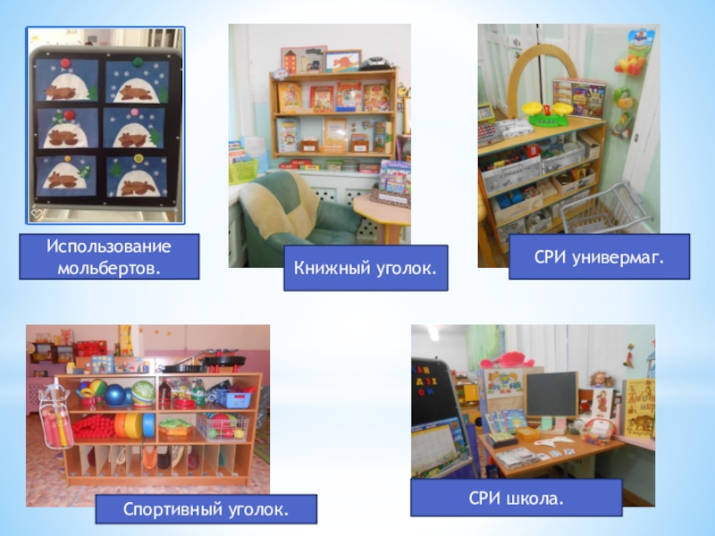 Использование мольбертов.Книжный уголок.СРИ универмаг.Спортивный уголок.СРИ школа.