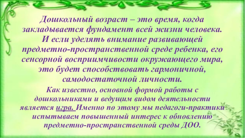 Как известно, основной формой работы с дошкольниками и ведущим видом деятельности является игра. Именно по этому мы педагоги-практики испытываем повышенный интерес к обновлению предметно-пространственной среды ДОО.