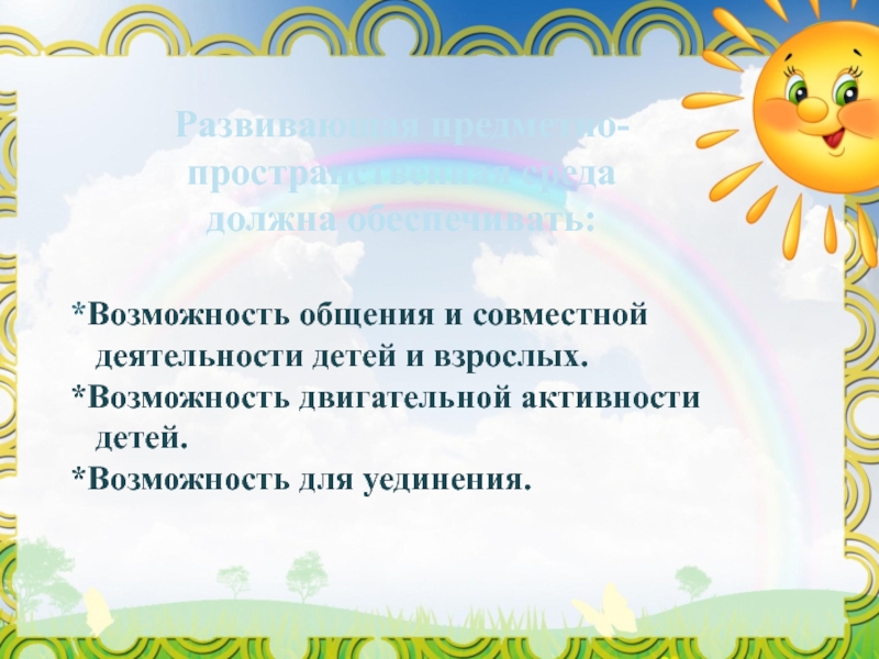 Развивающая предметно-пространственная среда должна обеспечивать: