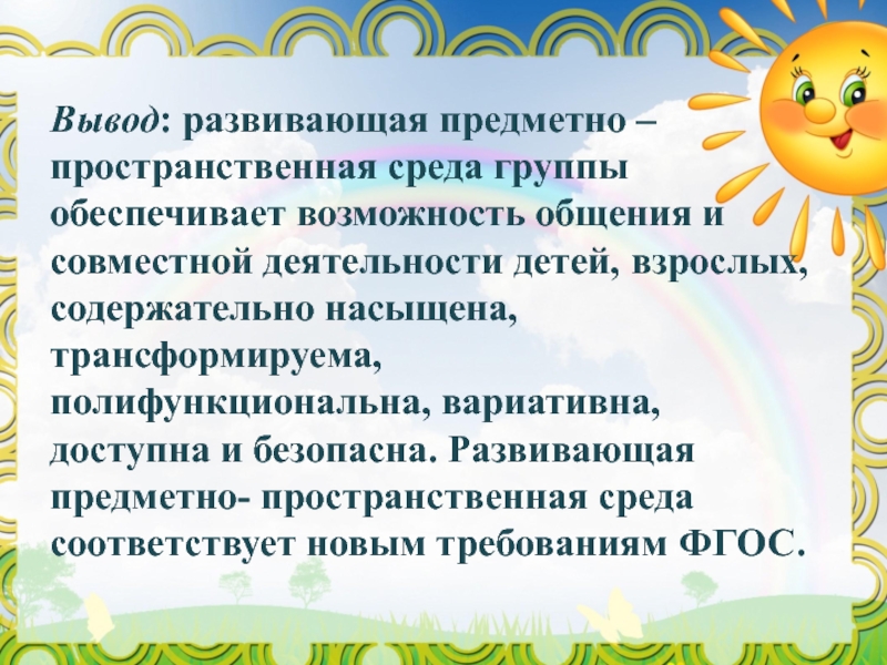 доступна и безопасна. Развивающая предметно- пространственная среда соответствует новым требованиям ФГОС.