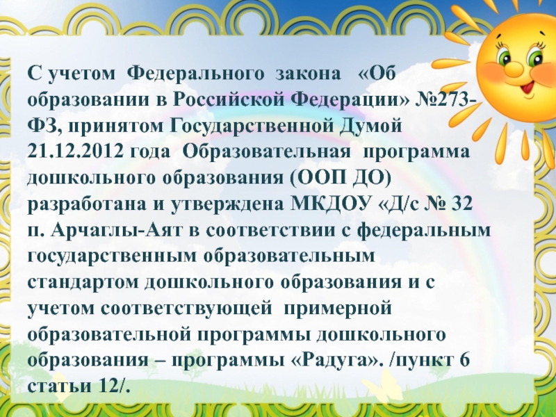 принятом Государственной Думой 21.12.2012 года Образовательная программа дошкольного образования (ООП ДО) разработана и утверждена МКДОУ «Д/с № 32 п. Арчаглы-Аят в соответствии с федеральным государственным образовательным стандартом дошкольного образования и с учетом соответствующей примерной образовательной программы дошкольного образования – программы «Радуга». /пункт 6 статьи 12/.
