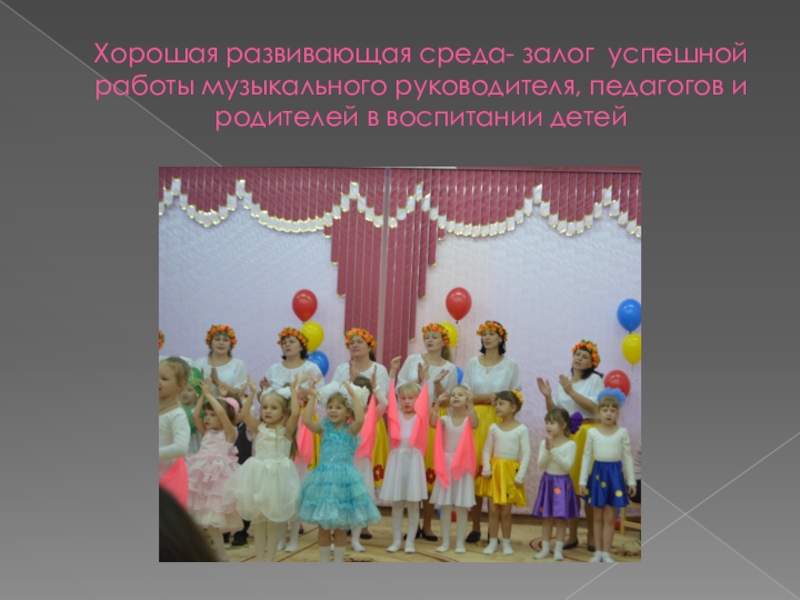 Слайд 31 Хорошая развивающая среда- залог успешной работы музыкального руководителя, педагогов и родителей