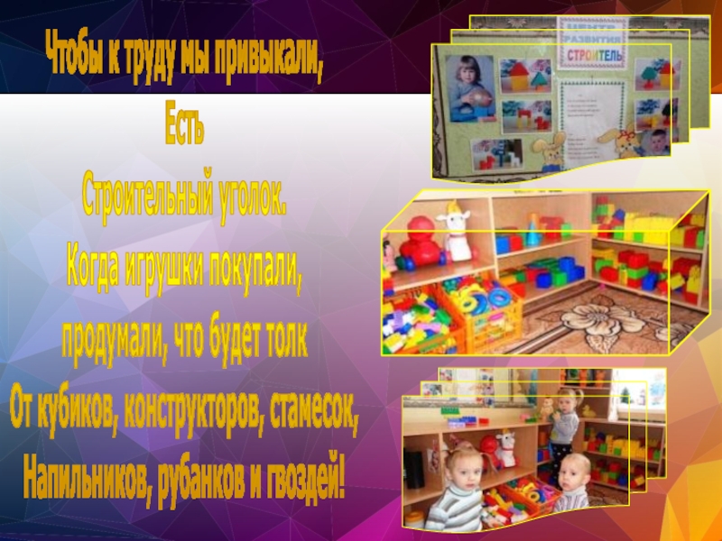 дружно игрушки убирать.