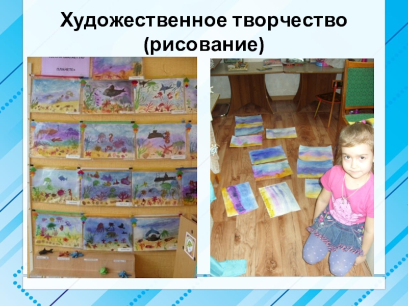 Репродукции картин И. К. Айвазовский «Ночь. Голубая волна», «Девятый вал», «Чёрное море», «Ураган на море», А. Рылов «Море. Камни», «В голубом просторе», А. Боголюбов «Парусник в море»;