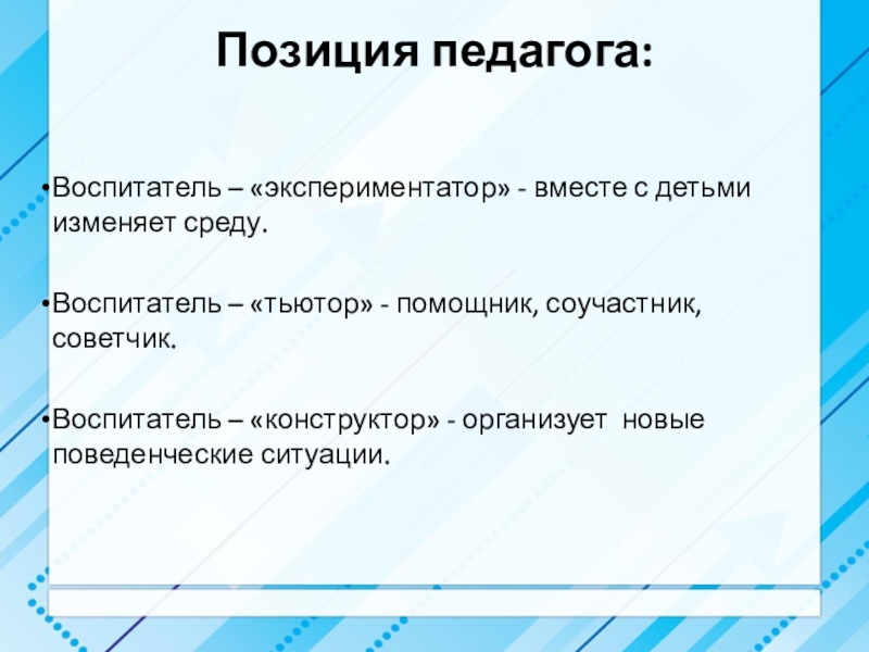 Воспитатель – «конструктор» - организует новые поведенческие ситуации.