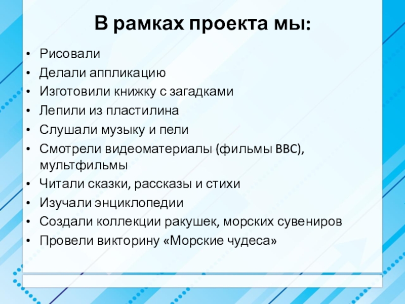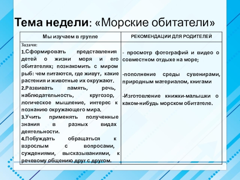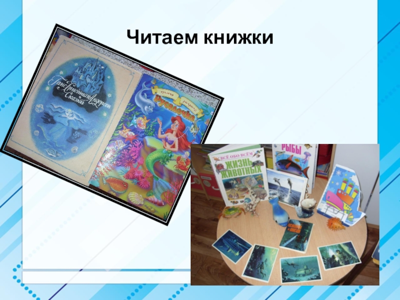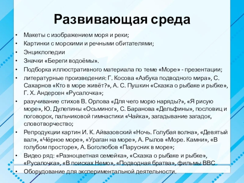 литературные произведения: Г. Косова «Азбука подводного мира», С. Сахарнов «Кто в море живёт?», А. С. Пушкин «Сказка о рыбаке и рыбке», Г. Х. Андерсен «Русалочка»;