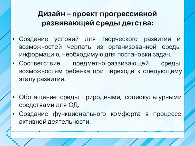 Слайд 6Дизайн – проект прогрессивной развивающей среды детства: