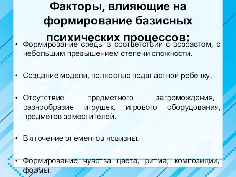Слайд 7Факторы, влияющие на формирование базисных психических процессов: