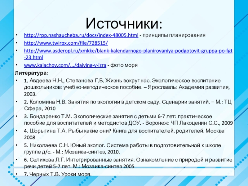 5. Николаева С.Н. Юный эколог. Система работы в подготовительной к школе группе д/с. - М.: Мозаика-синтез, 2010.
