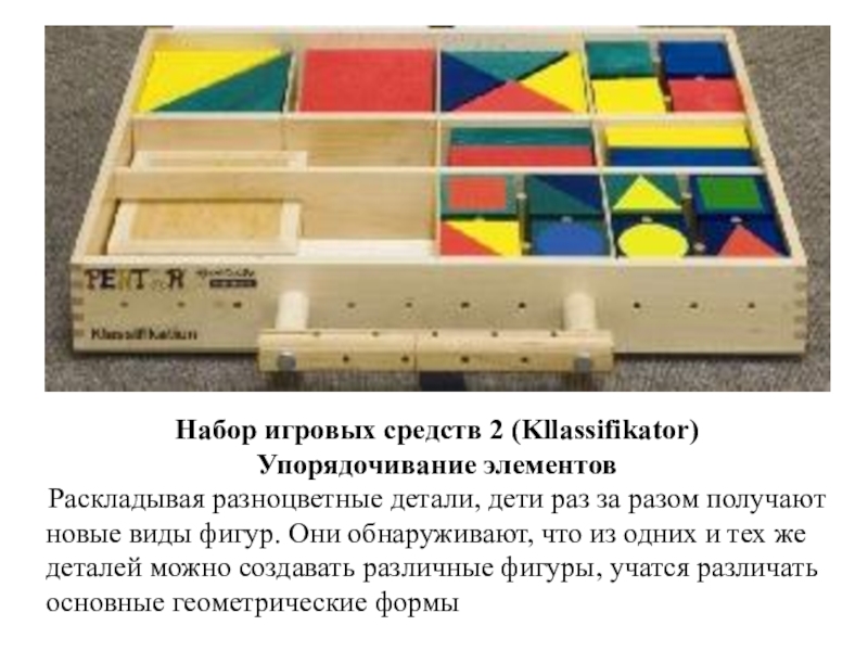 Набор игровых средств 2 (Kllassifikator)Упорядочивание элементовРаскладывая разноцветные детали, дети раз за разом получаютновые виды фигур. Они обнаруживают,