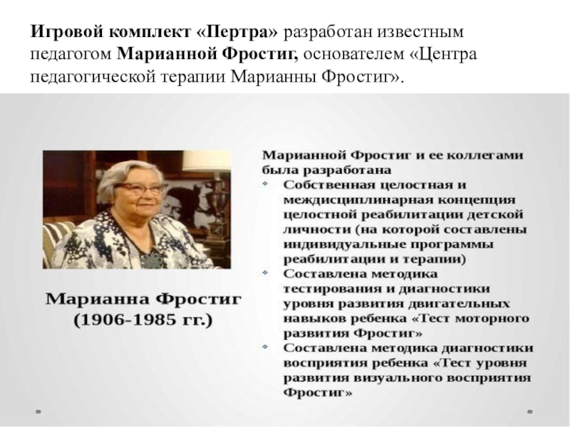 Слайд 3Игровой комплект «Пертра» разработан известным педагогом Марианной Фростиг, основателем «Центра педагогической