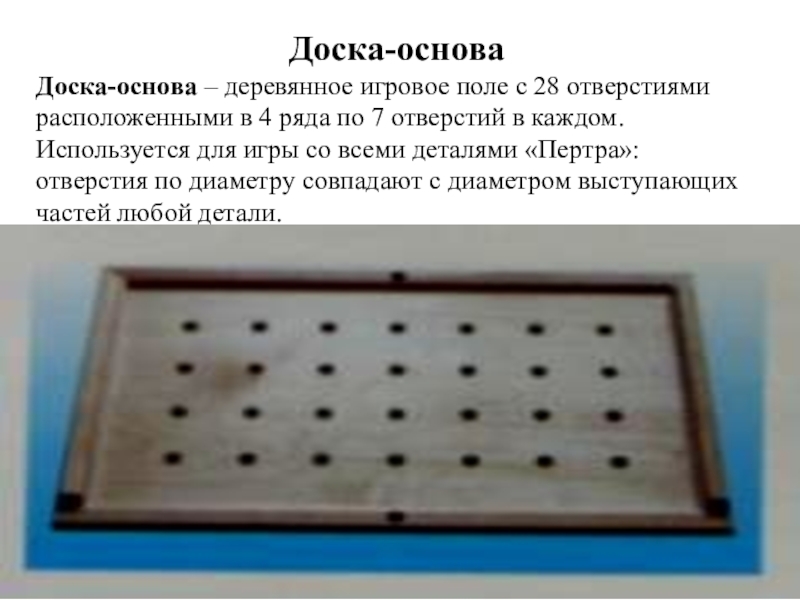 Доска-основаДоска-основа – деревянное игровое поле с 28 отверстиями расположенными в 4 ряда по 7 отверстий в каждом.Используется