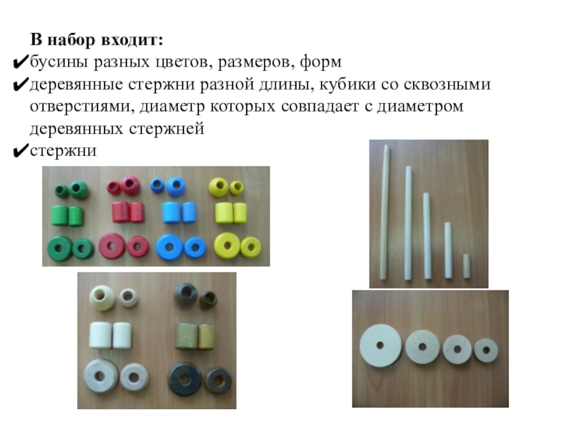 В набор входит:бусины разных цветов, размеров, формдеревянные стержни разной длины, кубики со сквозными отверстиями, диаметр которых совпадает