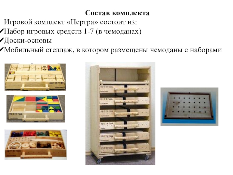 Состав комплектаИгровой комплект «Пертра» состоит из:Набор игровых средств 1-7 (в чемоданах)Доски-основыМобильный стеллаж, в котором размещены чемоданы с