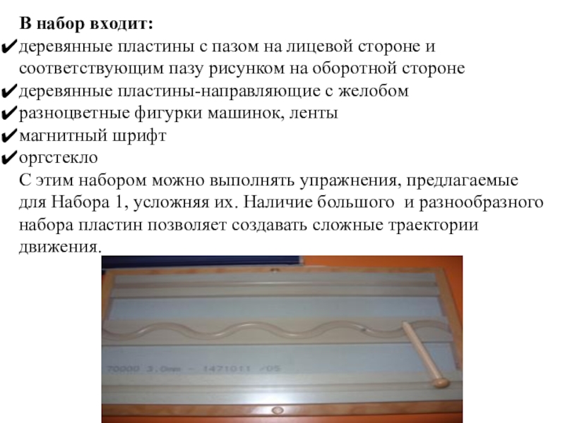 В набор входит:деревянные пластины с пазом на лицевой стороне и соответствующим пазу рисунком на оборотной сторонедеревянные пластины-направляющие