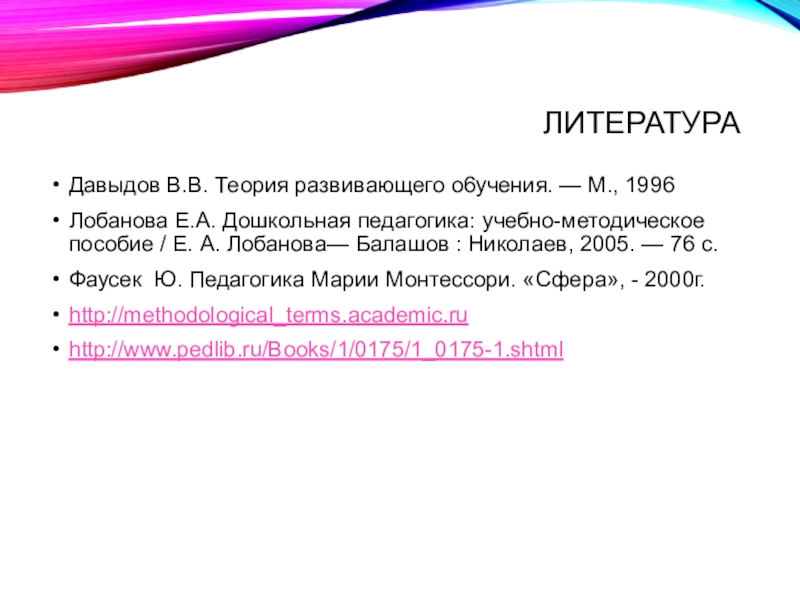 Фаусек Ю. Педагогика Марии Монтессори. «Сфера», - 2000г.