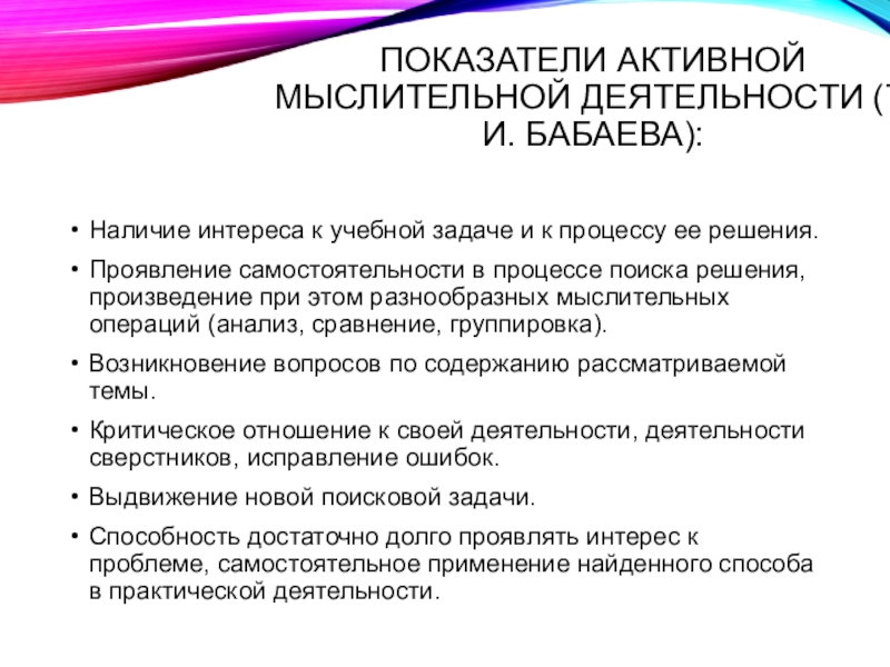 Слайд 13Показатели активной мыслительной деятельности (Т.И. Бабаева):