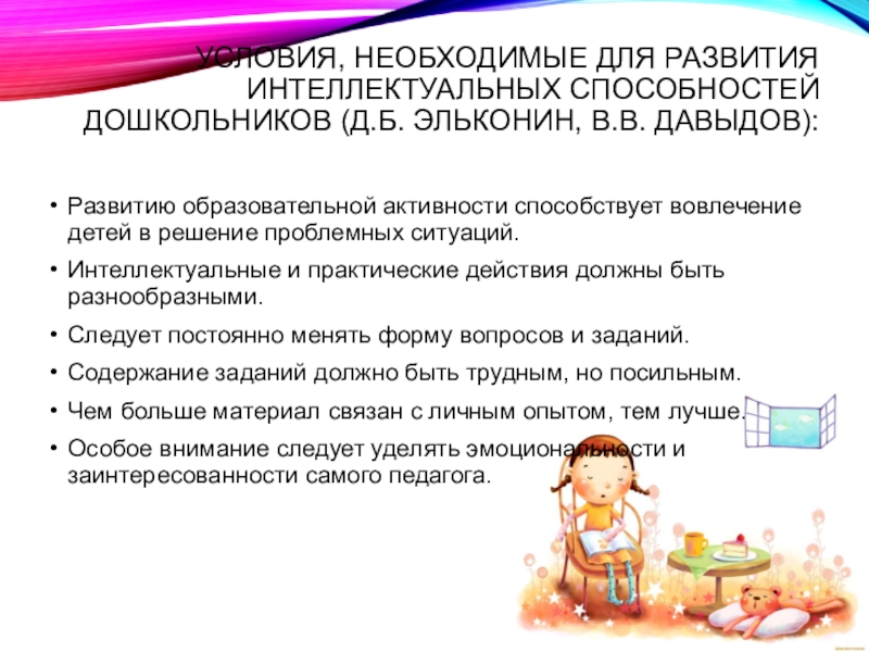 Слайд 12Условия, необходимые для развития интеллектуальных способностей дошкольников (Д.Б. Эльконин, В.В. Давыдов):