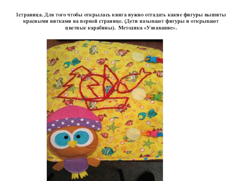 1страница. Для того чтобы открылась книга нужно отгадать какие фигуры вышиты красными нитками на первой странице. (Дети называют фигуры и открывают цветные карабины). Методика «Узнавание».