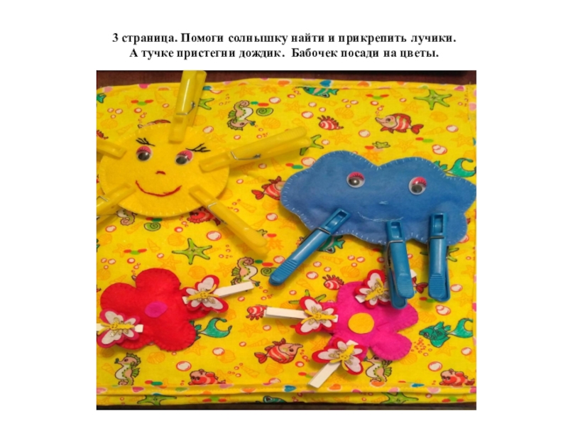 3 страница. Помоги солнышку найти и прикрепить лучики.  А тучке пристегни дождик. Бабочек посади на цветы.