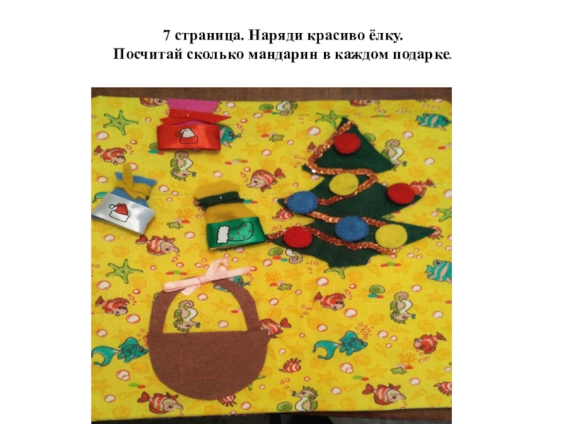 7 страница. Наряди красиво ёлку.  Посчитай сколько мандарин в каждом подарке.