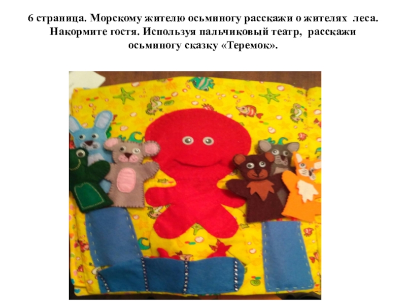 6 страница. Морскому жителю осьминогу расскажи о жителях леса. Накормите гостя. Используя пальчиковый театр, расскажи осьминогу сказку