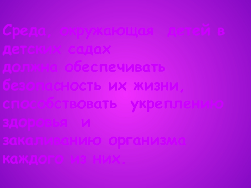 Среда, окружающая детей в детских садахдолжна обеспечивать безопасность их жизни,способствовать укреплению здоровья и закаливанию организма каждого из