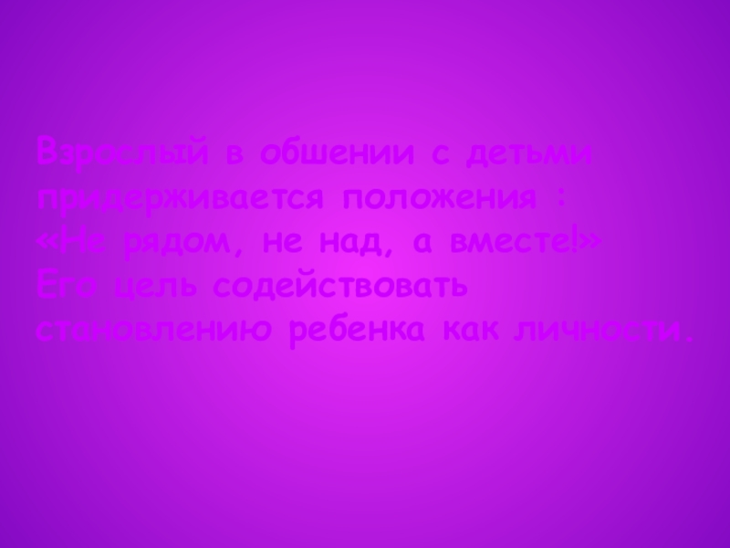 Взрослый в обшении с детьми придерживается положения : «Не рядом, не над, а вместе!» Его цель содействовать