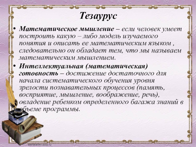 Интеллектуальная (математическая) готовность – достижение достаточного для начала систематического обучения уровня зрелости познавательных процессов (память, восприятие, мышление, воображение, речь), овладение ребенком определенного багажа знаний в объеме программы.