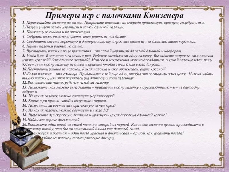 8. Угадай-ка. Выставить палочки в ряд. Ребенок загадывает одну палочку. Вы задаете вопросы: эта палочка короче красной? Она длиннее желтой? Методом исключения можно догадаться, о какой палочке идет речь.