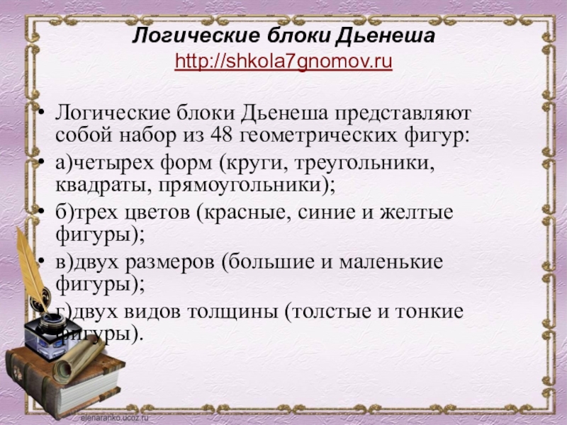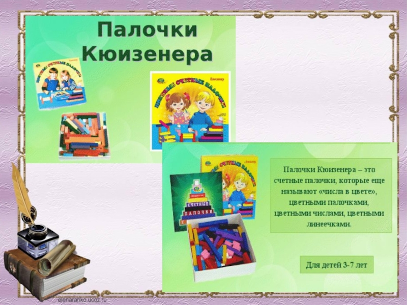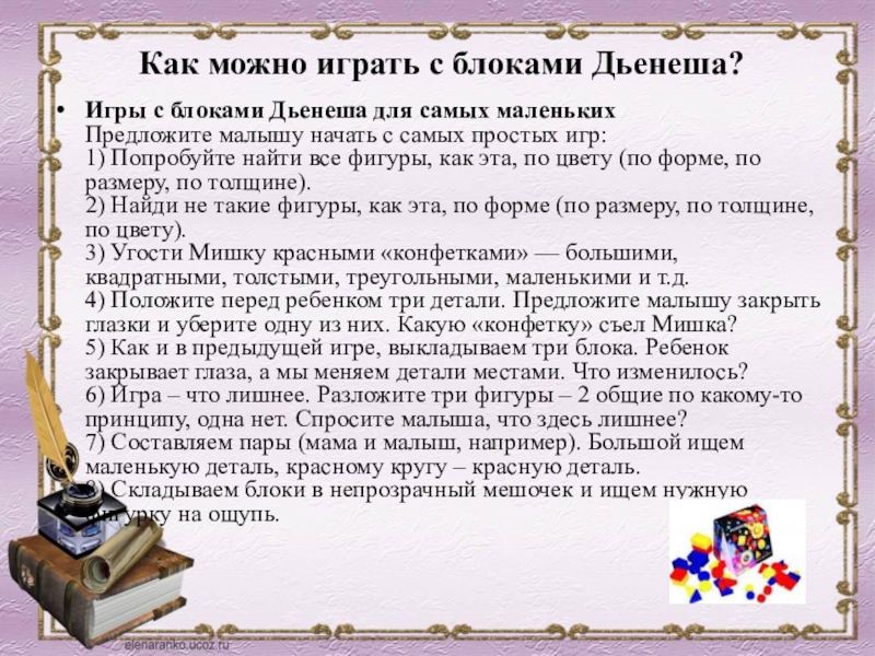 — отдельные дидактические средства: блоки 3. Дьенеша (логические блоки), палочки X. Кюзенера, счетный материал (отличный от того, что применяется на занятиях), кубики с цифрами и знаками, детские вычислительные машины и многое другое;