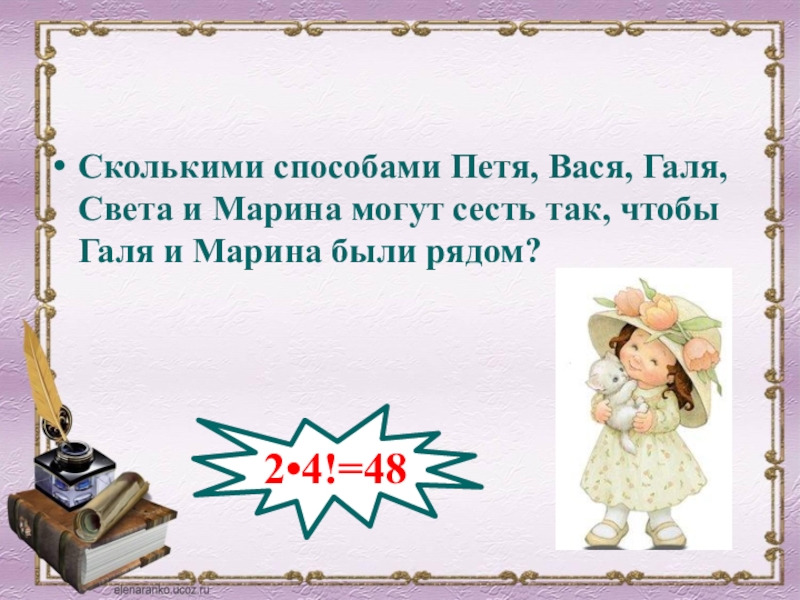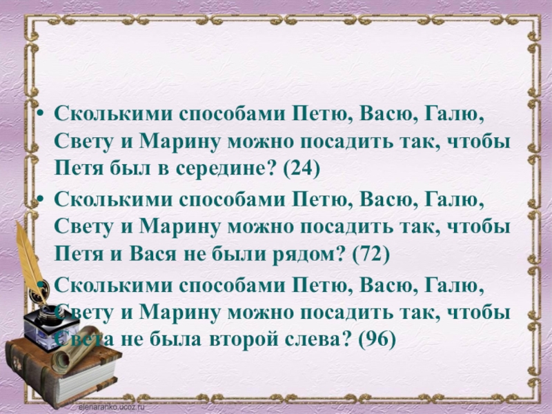 Слайд 16Сколькими способами Петю, Васю, Галю, Свету и Марину можно посадить так,