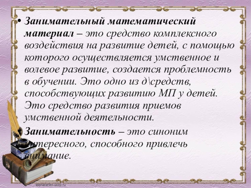 Слайд 6Занимательный математический материал – это средство комплексного воздействия на развитие детей,