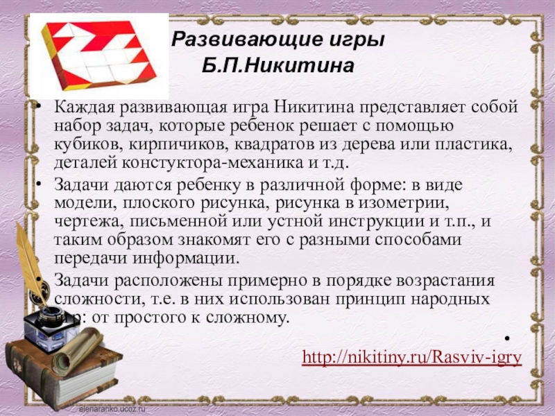 Каждая развивающая игра Никитина представляет собой набор задач, которые