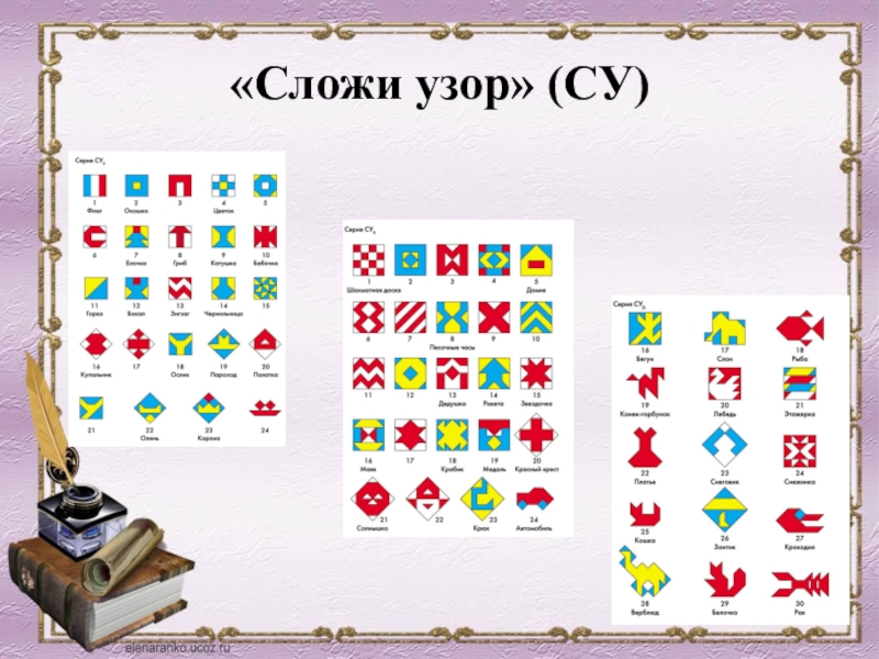 — занимательный математический материал: головоломки, геометрические мозаики и конструкторы, лабиринты, задачи-шутки, задачи на трансфигурацию и т. д. с приложением там, где это необходимо, образцов (например, для игры «Танграм» требуются образцы, расчлененные и нерасчлененные, контурные), наглядных инструкций и т. д.;