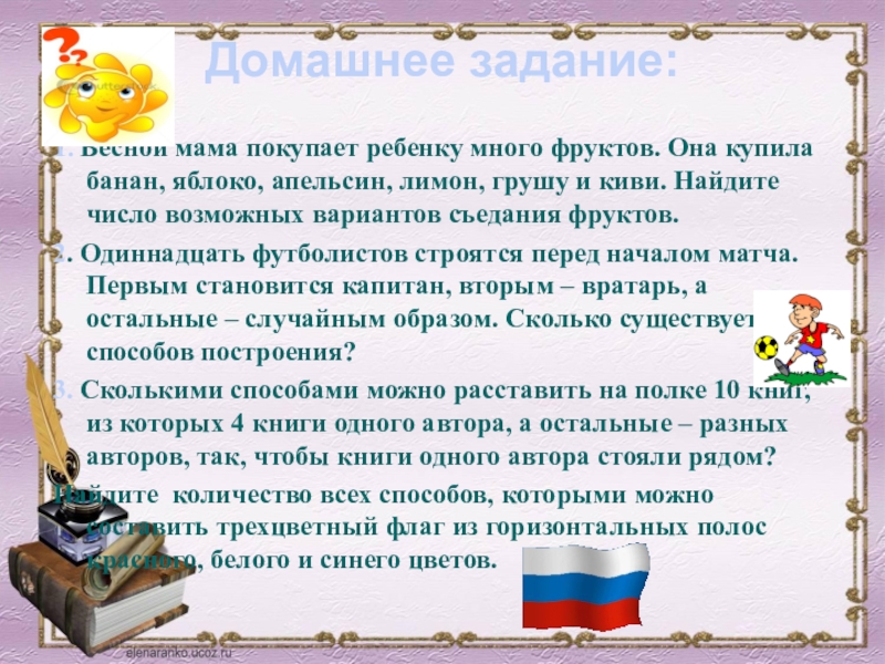 яблоко, апельсин, лимон, грушу и киви. Найдите число возможных вариантов съедания фруктов.