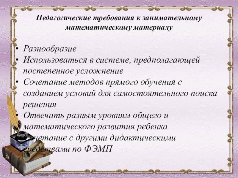 Слайд 8Педагогические требования к занимательному математическому материалу